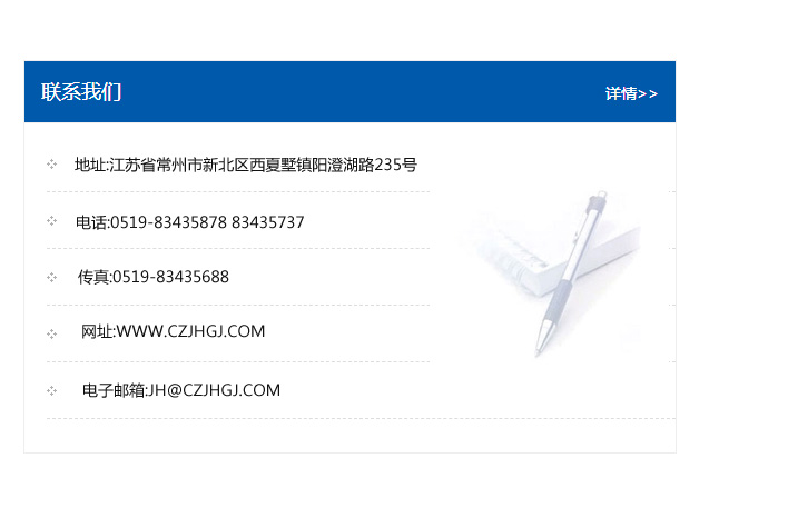 傳真:0519-83435688    郵編:213135    網(wǎng)址:WWW.czjhgj_com.zsyakq.com    電子郵箱:JH@czjhgj_com.zsyakq.com